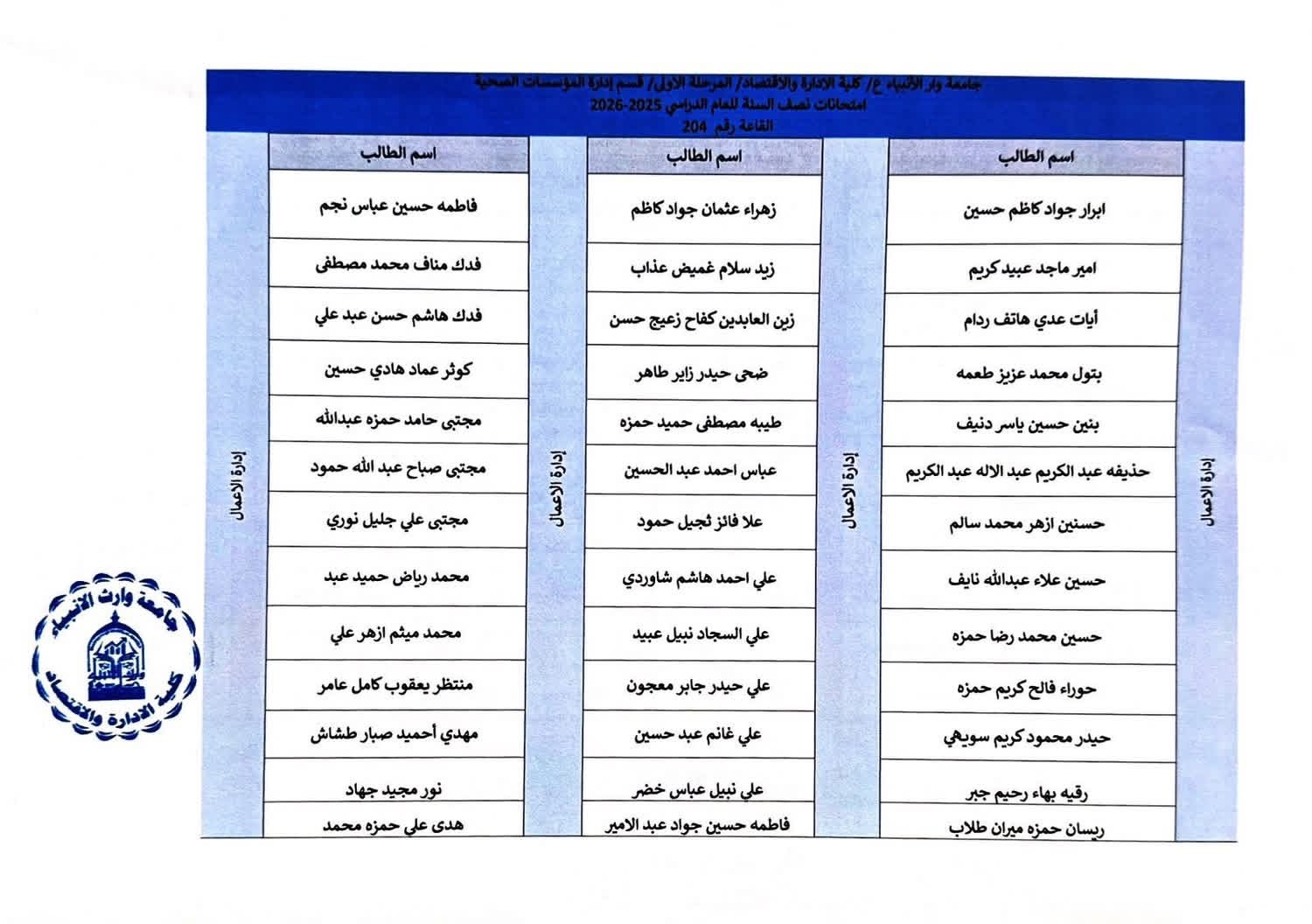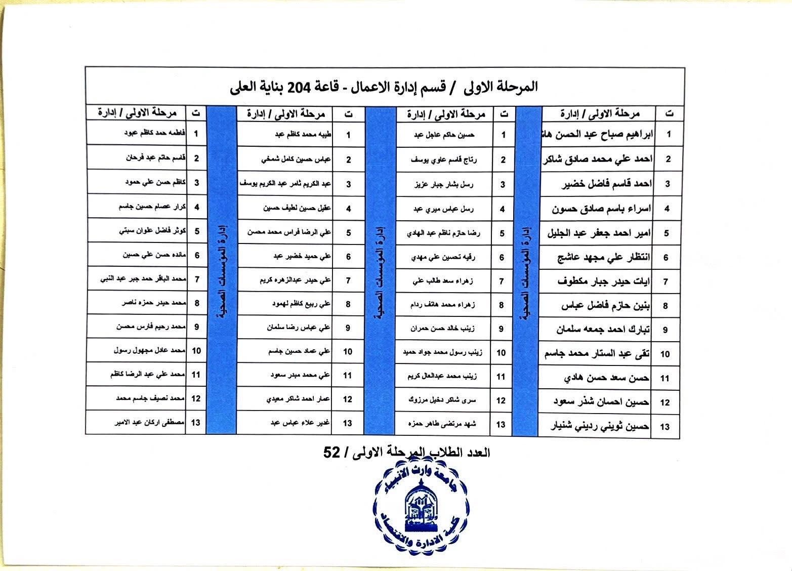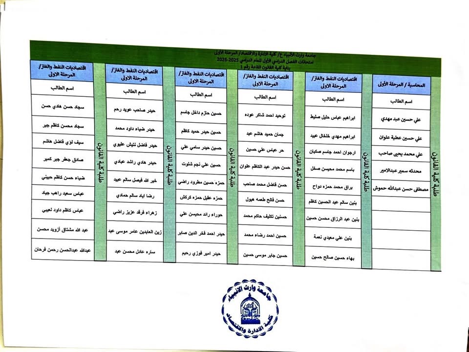 خرائط الجلوس الخاصة بالقاعات الامتحانية للمرحلة الاولى ولكافة اقسام الكلية
