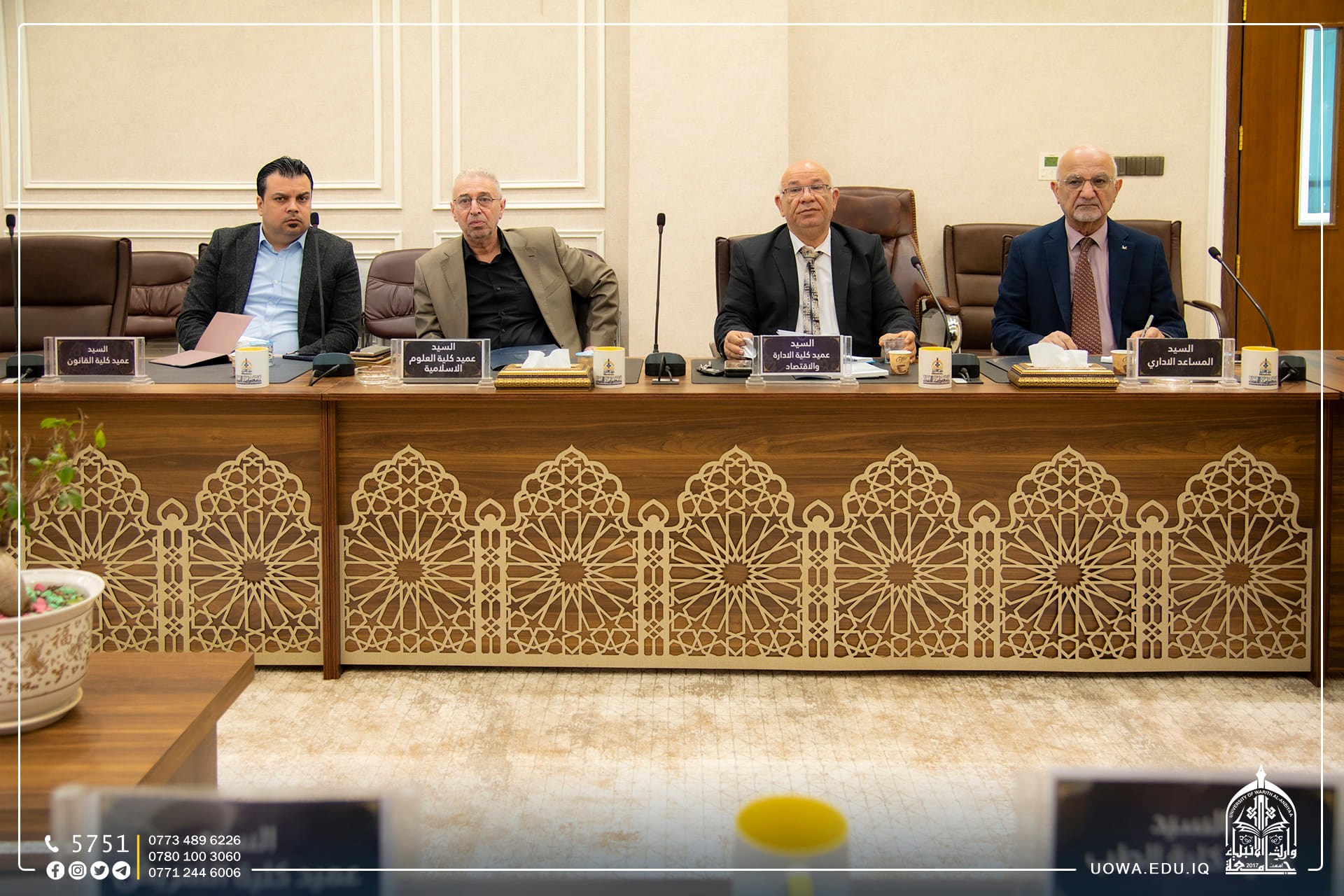 مجلس جامعة وارث الانبياء(عليه السلام) يعقد جلسته الاعتيادية برئاسة الاستاذ الدكتور ابراهيم الحياوي وعضوية السادة مساعدي رئيس الجامعة للشؤون الإدارية والعلمية والسادة عمداء الكليات لمناقشة جملة من القرارات التي تخدم الجامعة وطلبتها الاعزاء.