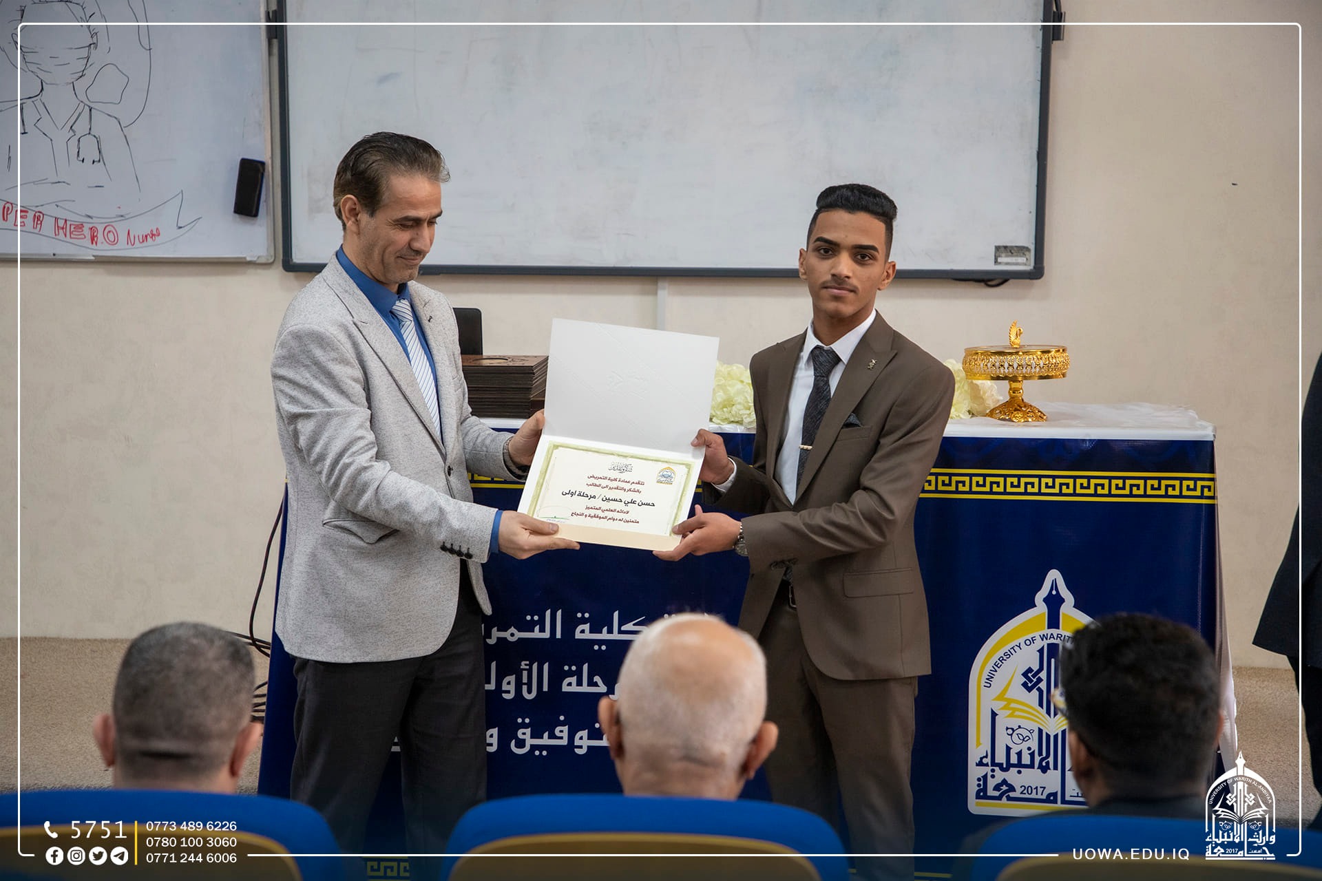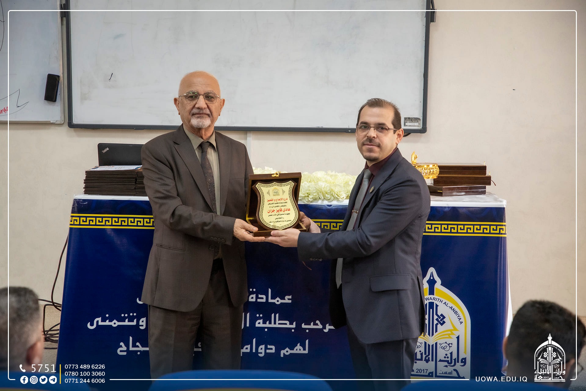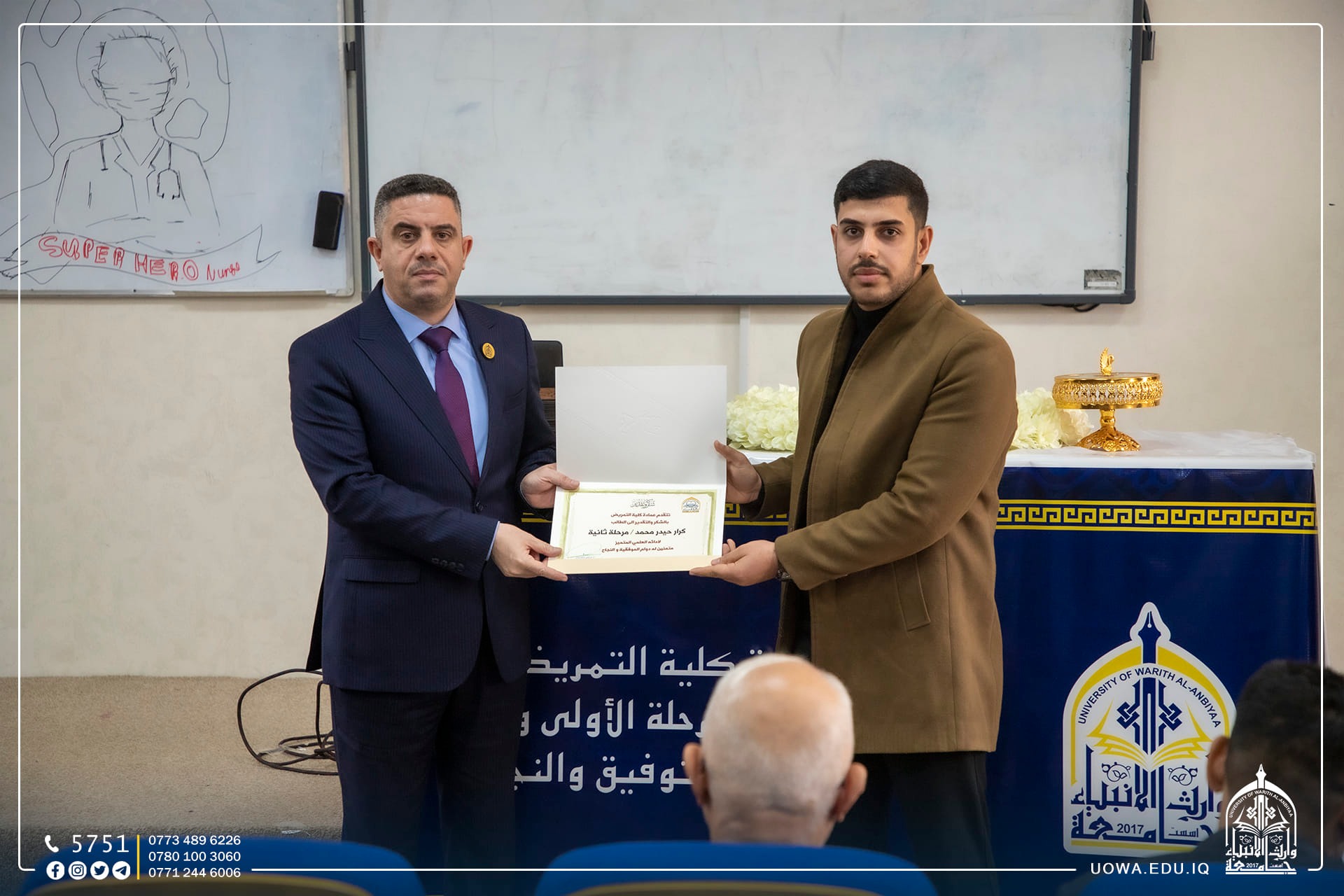بحضور السيد المساعد الإداري الاستاذ الدكتور نوفل الاعرجي ، أقامت عمادة كلية التمريض في جامعة وارث الأنبياء (عليه السلام) احتفالية استقبال طلبة المرحلة الأولى بالإضافة الى تكريم الطلبة الاوائل للسنة الماضية ليكونوا حافزا لبقية الطلبة بأن يحذوا حذو زملائهم في التميز العلمي والاخلاقي.