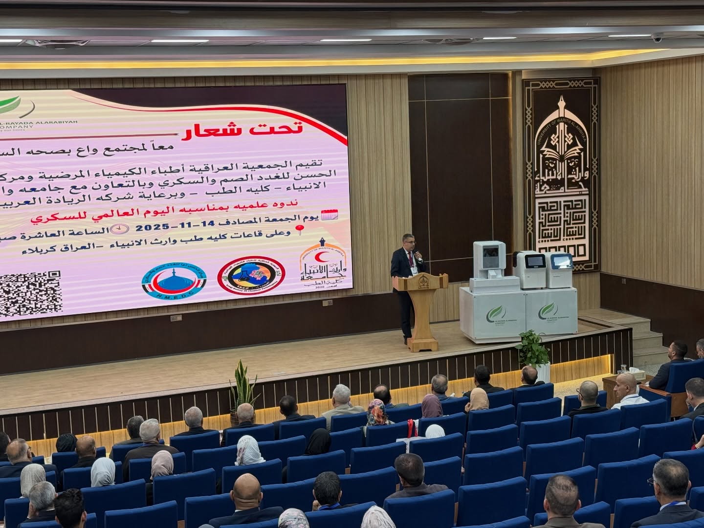 تحت شعار “معاً لمجتمع واعٍ بصحة السكري” احتضنت كلية الطب في جامعة وارث الأنبياء (عليه السلام) اليوم الجمعة الموافق 14 تشرين الثاني 2025، الندوة العلمية المتخصصة التي أقامتها الجمعية العراقية لأطباء الكيمياء المرضية بالتعاون مع مركز الحسن للغدد الصم والسكري وبرعاية شركة الريادة العربية، وبمشاركة أساتذة وباحثين مختصين من مختلف المراكز العلمية داخل العراق وخارجه.