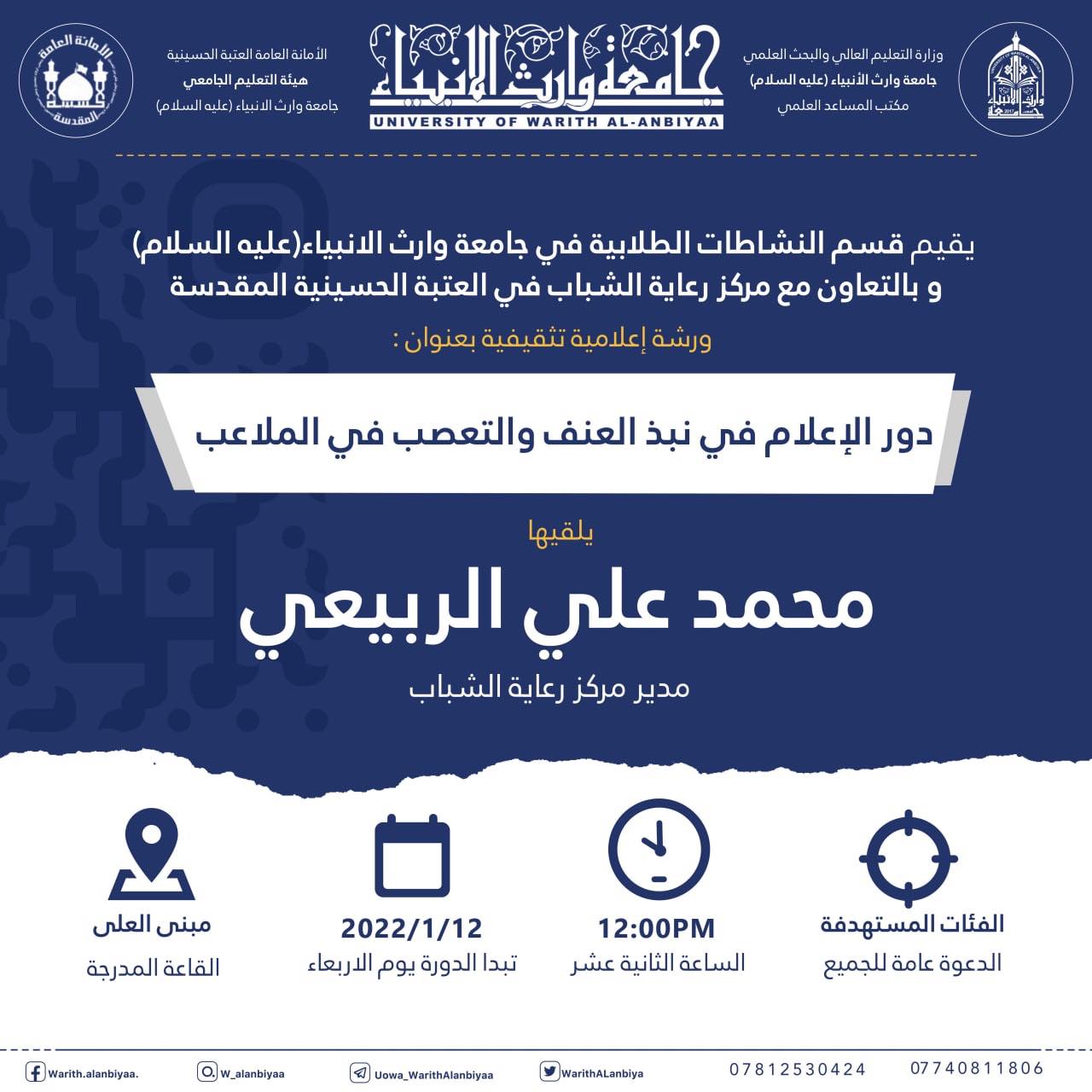 ضمن سعيه الحثيث لتخريج طلبة يتقنون تخصصهم، أقام قسم هندسة الطب الحياتي في جامعة وارث الأنبياء (عليه السلام) وبالتعاون مع جمعية نبضة للهندسة الطبية ورشة عمل تدريبية عن كيفية تصميم وبناء مشروع التخرج للطلبة. قدمها المهندس حسام من الجمعية المذكورة.جدير بالذكر أن الورشة نالت استحسان وتفاعل كبير من قبل طلبة القسم .ومن جانبها أعربت الجمعية عن شكرها للدكتور حاكم الجبوري عميد كلية الهندسة والدكتور حسين سالم رئيس قسم هندسة الطب الحياتي لتعاونهما في تنظيم وإنجاز الورشة.