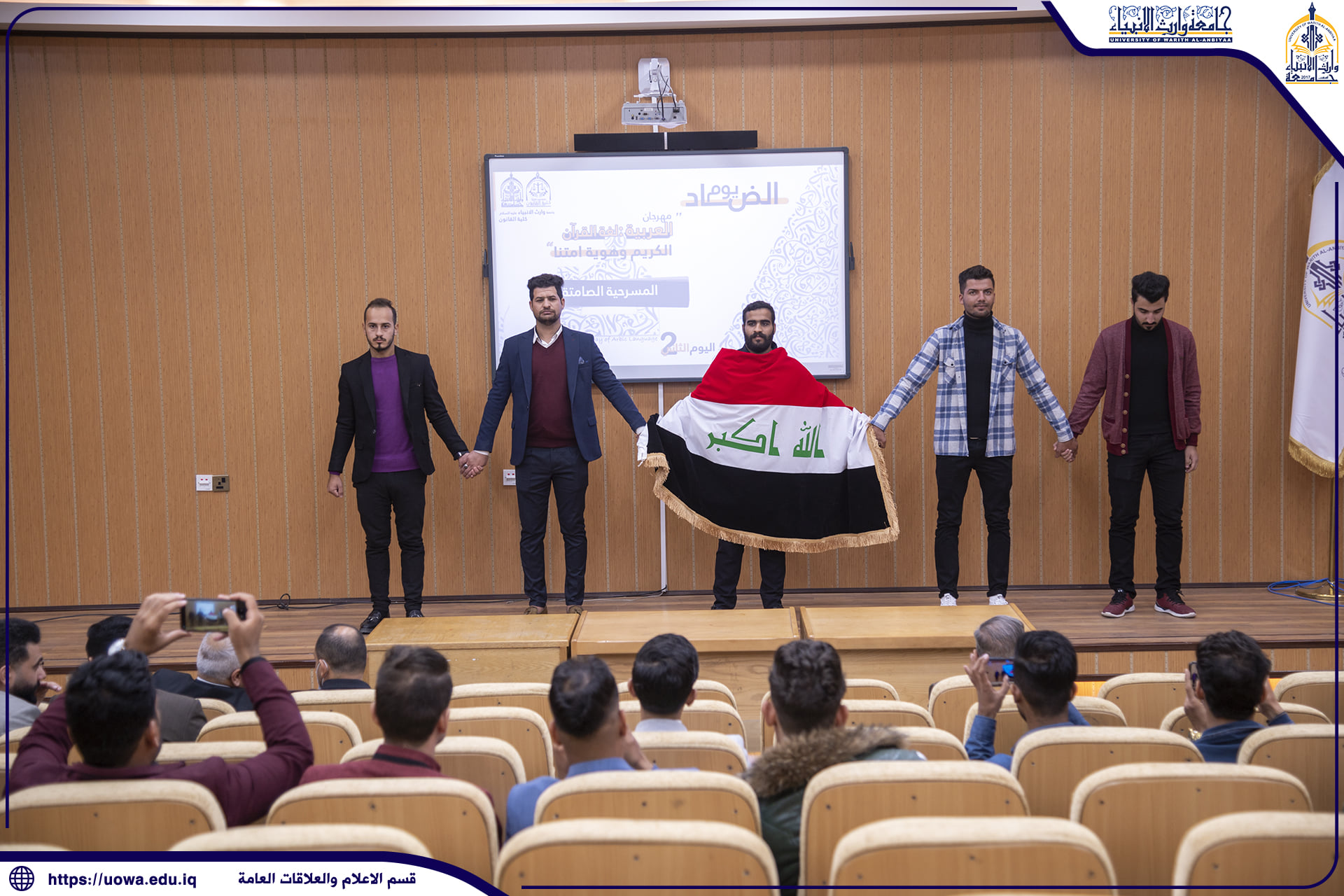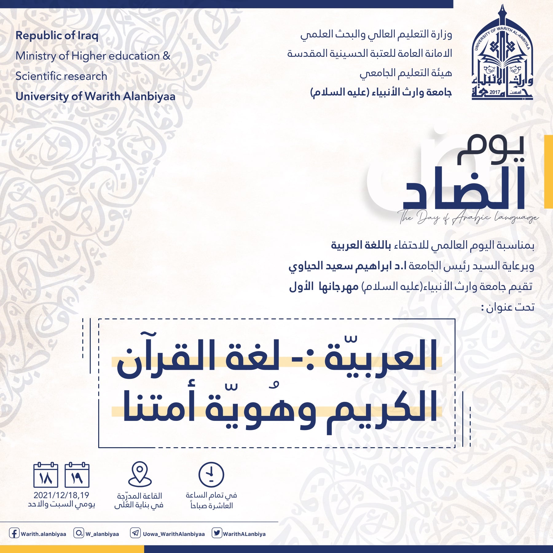 بمناسبة اليوم العالمي للغة العربية ،وبحضور السيد رئيس هيئة التعليم الجامعي الاستاذ الدكتور حيدر التميمي ،وبرعاية السيد رئيس الجامعة الاستاذ الدكتور ابراهيم الحياوي. اقامت جامعة وارث الانبياء(عليه السلام) ،وبالتعاون مع كليتي العلوم الإسلامية وكلية القانون مهرجانها الاولتحت عنوان( العربية:-لغة القرآن الكريم وهوية أمتنا) الذي يستمر لمدة يومين بحضور نوعي وكمي لأساتذة اللغة العربية والمهتمين بها والطلبة،حيث شهد المهرجان في يومه الاول ،طرح ورقتين بحثيتين لإثنين من كبار الباحثين في اللغة ،لبيان اهميتها ومفاصلها باعتبارها هوية امة من الواجب التمسك والاعتزاز بها.