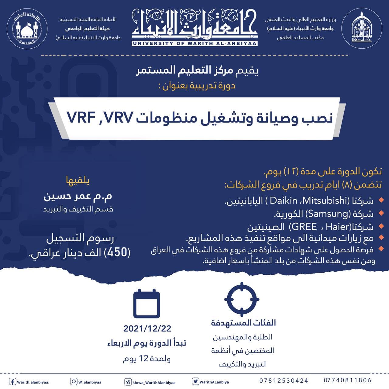 اقامت جامعة وارث الأنبياء عليه السلام دورة بعنوان دورة التكييف المركزي المتكاملة حيث اشترك 8 أعضاء فيها تدربو على المحاور التالية حساب الأحمال الحرارية والتصميم الداخلي للوحدات الطرفية ومحطات التكييف المركزي المتكاملة بجميع اجزائها المتنوعة كذلك تم الاطلاع على محتوى دليل المهندس المقيم وتدربو على مفرداته بما يخص الجانب الميكانيكي كذلك تم شرح دليل التسعير لوزارة الإعمار والإسكان كما كان الجانب العملي في العتبة العباسية المقدسة مستشفى الكفيل التخصصي والعتبة الحسينية المقدسة مركز وارث الدولي للأورام وكذلك شركة دايكن فرع العراق في بغداد.
