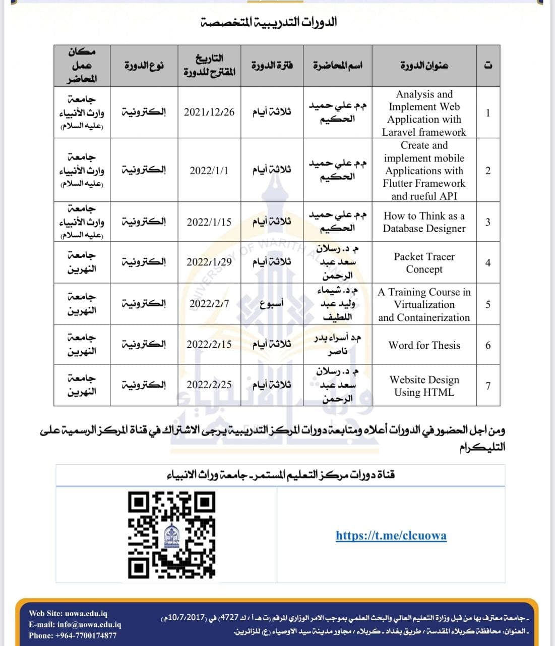 الاطلاع على الدورات المقامة من قبل المركز عبر الرابط الاتي:https://t.me/clcuowa