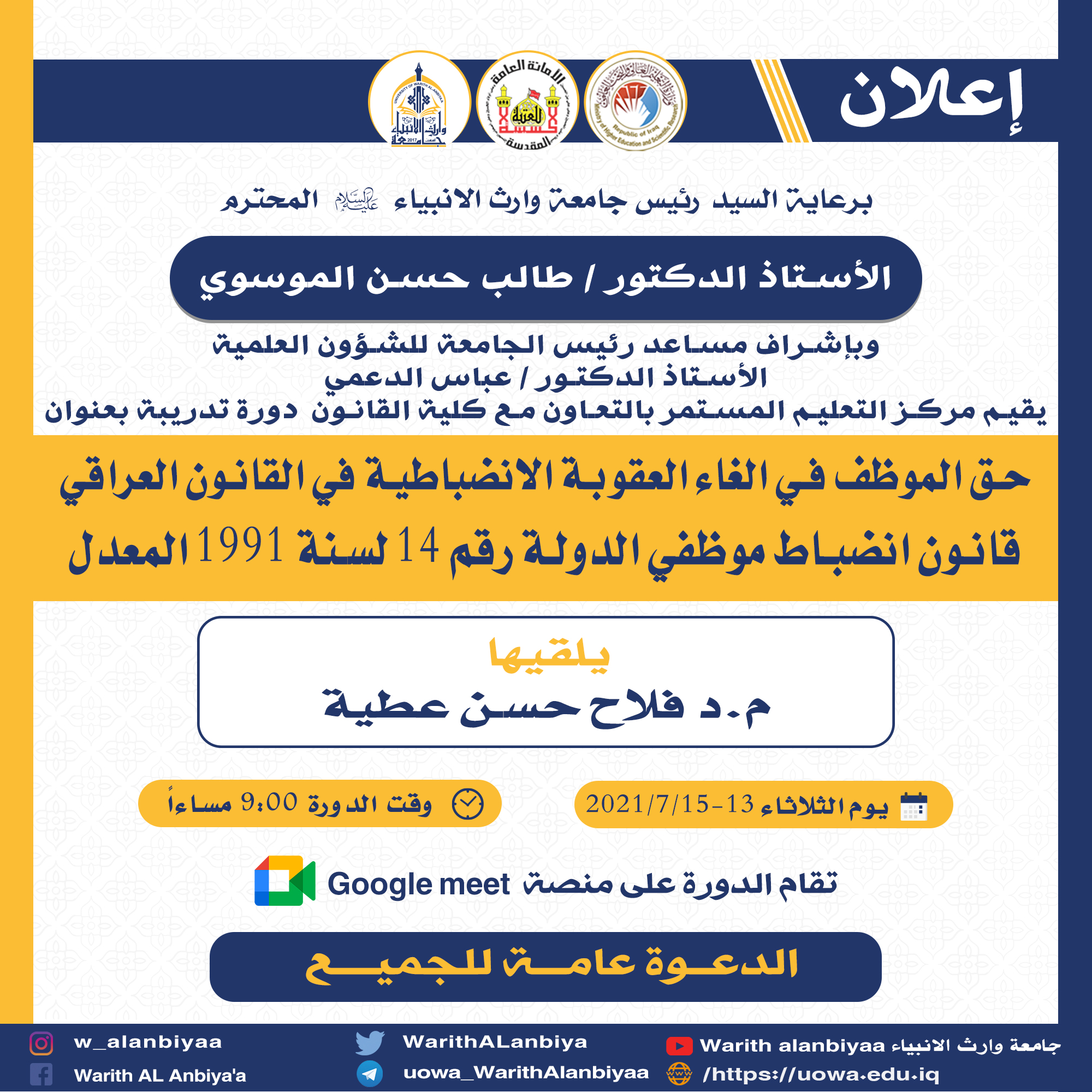 يقيم قسم التعليم المستمر في جامعة وارث الأنبياء (عليه السلام) بالتعاون مع كلية القانون / دورة تحت عنوان " حق الموظف في الغاء العقوبة الانضباطية في القانون العراقي- قانون انضباط موظفي الدولة رقم 14 لسنة 1991 المعدل" ولمدة ثلاث ايام وللفترة من 13-7-2021 الى 15-7-2021 ، والتي سيلقيها (م.د فلاح حسن عطية) على منصة التعليم الالكتروني الخاصة بجامعة وارث الانبياء(عليه السلام) -ضمن كورس التعليم المستمر. كما يمكن للزائرين من خارج الجامعة الدخول الى الدورة من خلال الرابط التالي: