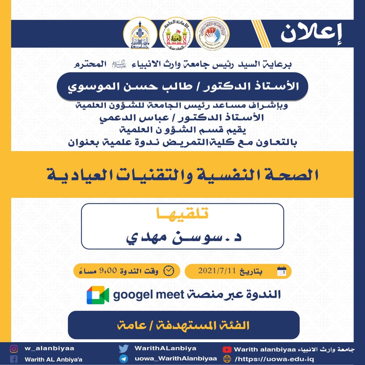 يحاضر في الدورة (م.د. خير الله مهدي) وبادراة (م.م احمد حميد عباس الشكري) على مدى ثلاث ايام (الاثنين ، الاربعاء و السبت) الموافق 2021/7/10،7،5 في تمام الساعة التاسعة مساءاً على منصة التعليم الالكتروني التابعة لجامعة وارث الانبياء (عليه السلام) / كورس التعليم المستمر او من خلال الدخول على الرابط ادناه: (https://meet.google.com/oki-gozn-hoq)