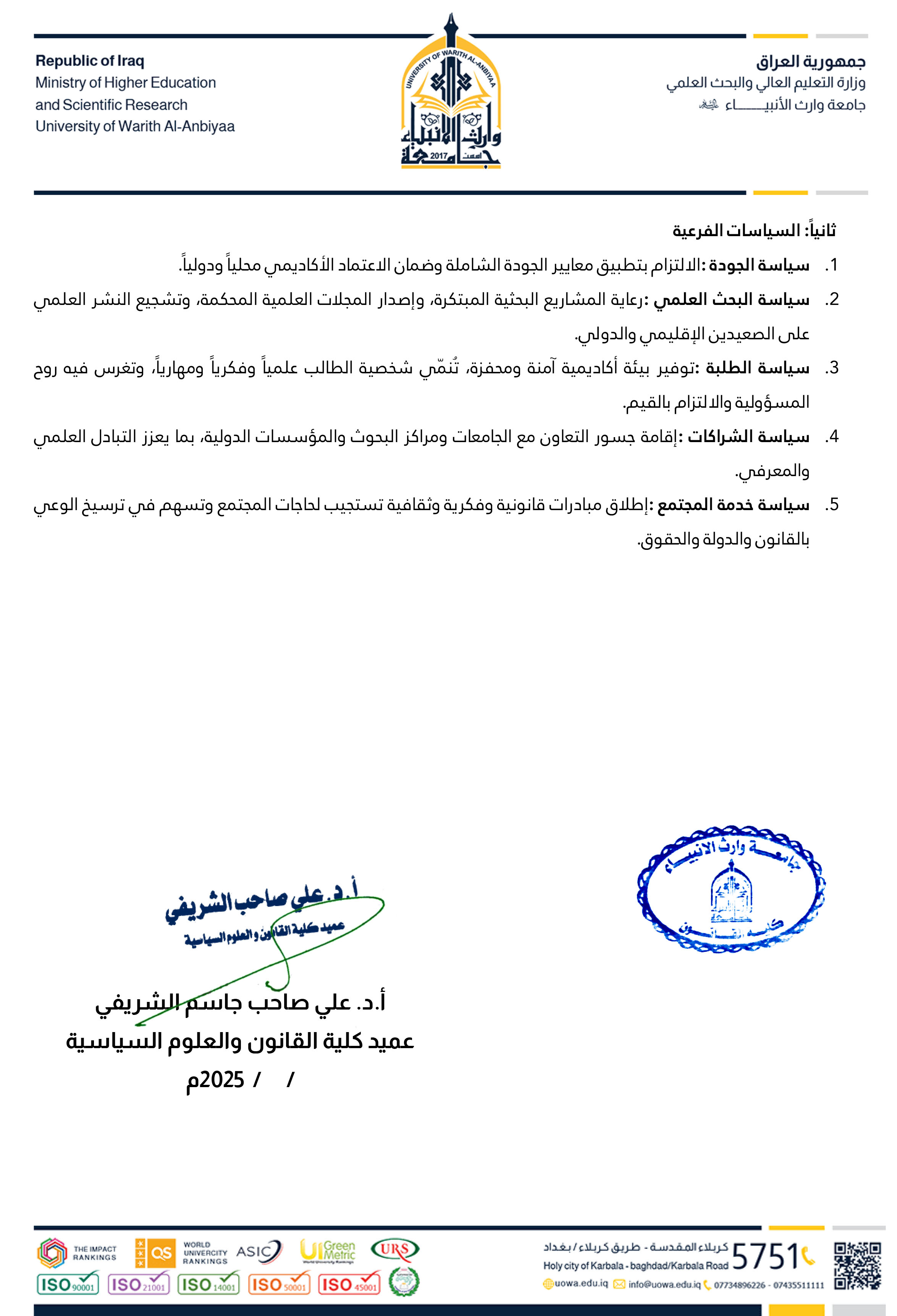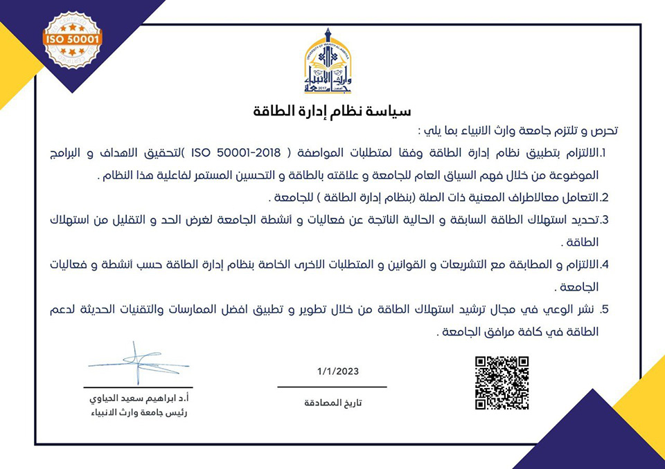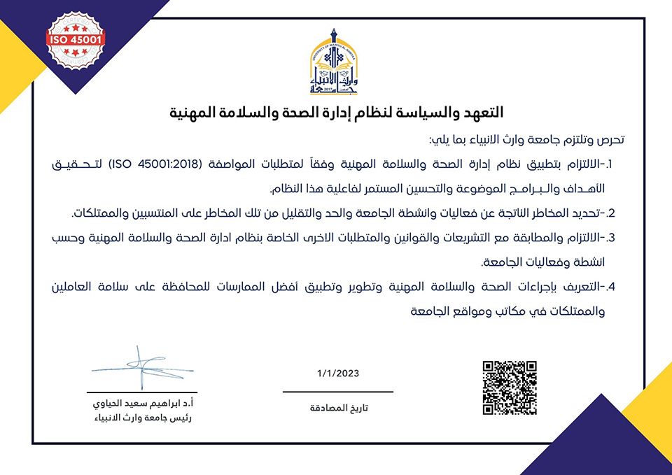 تحرص وتلتزم رئاسة جامعة وارث الانبياء بما يلي: