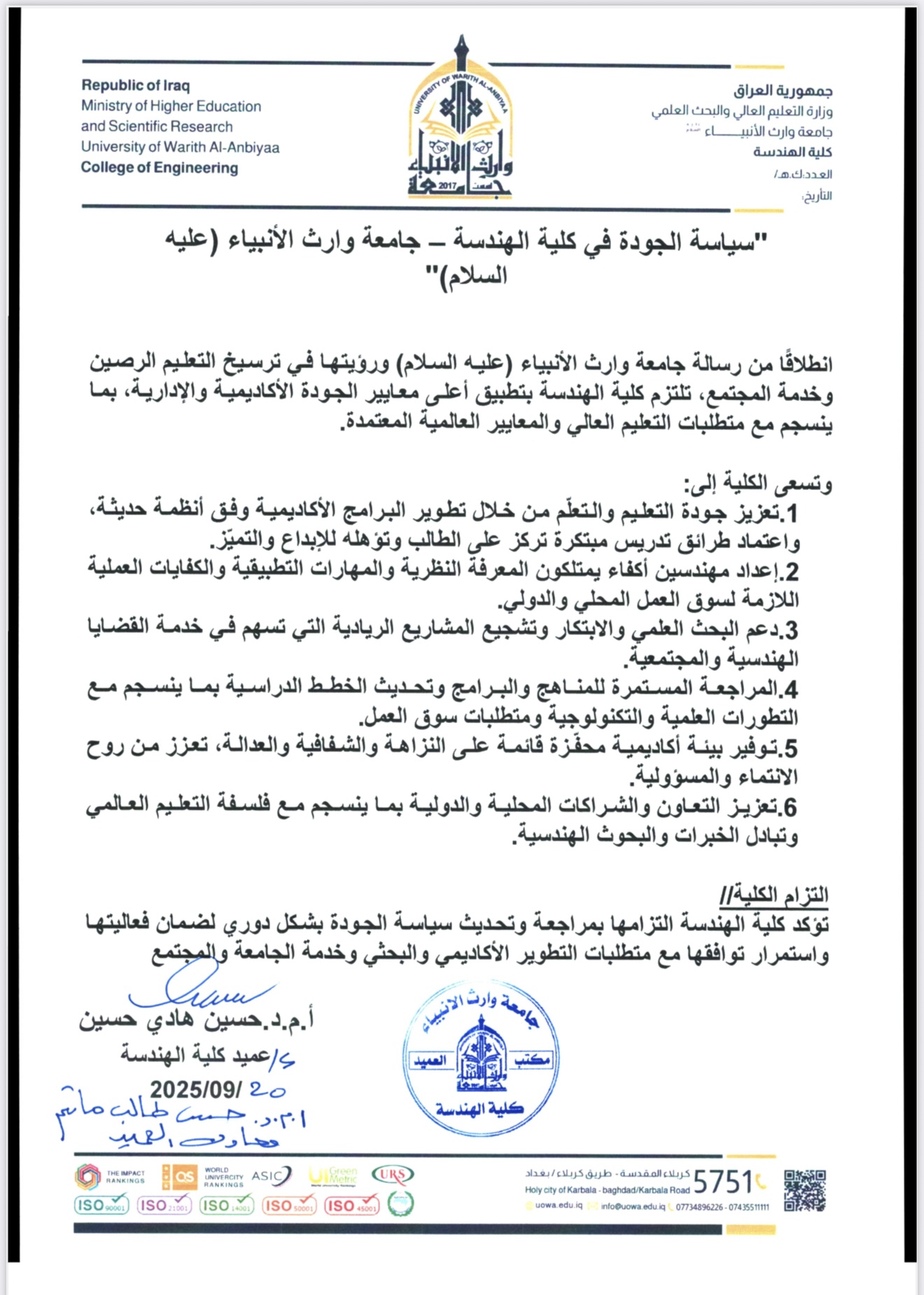 سياسة الجودة في كلية الهندسة – جامعة وارث الأنبياء (عليه