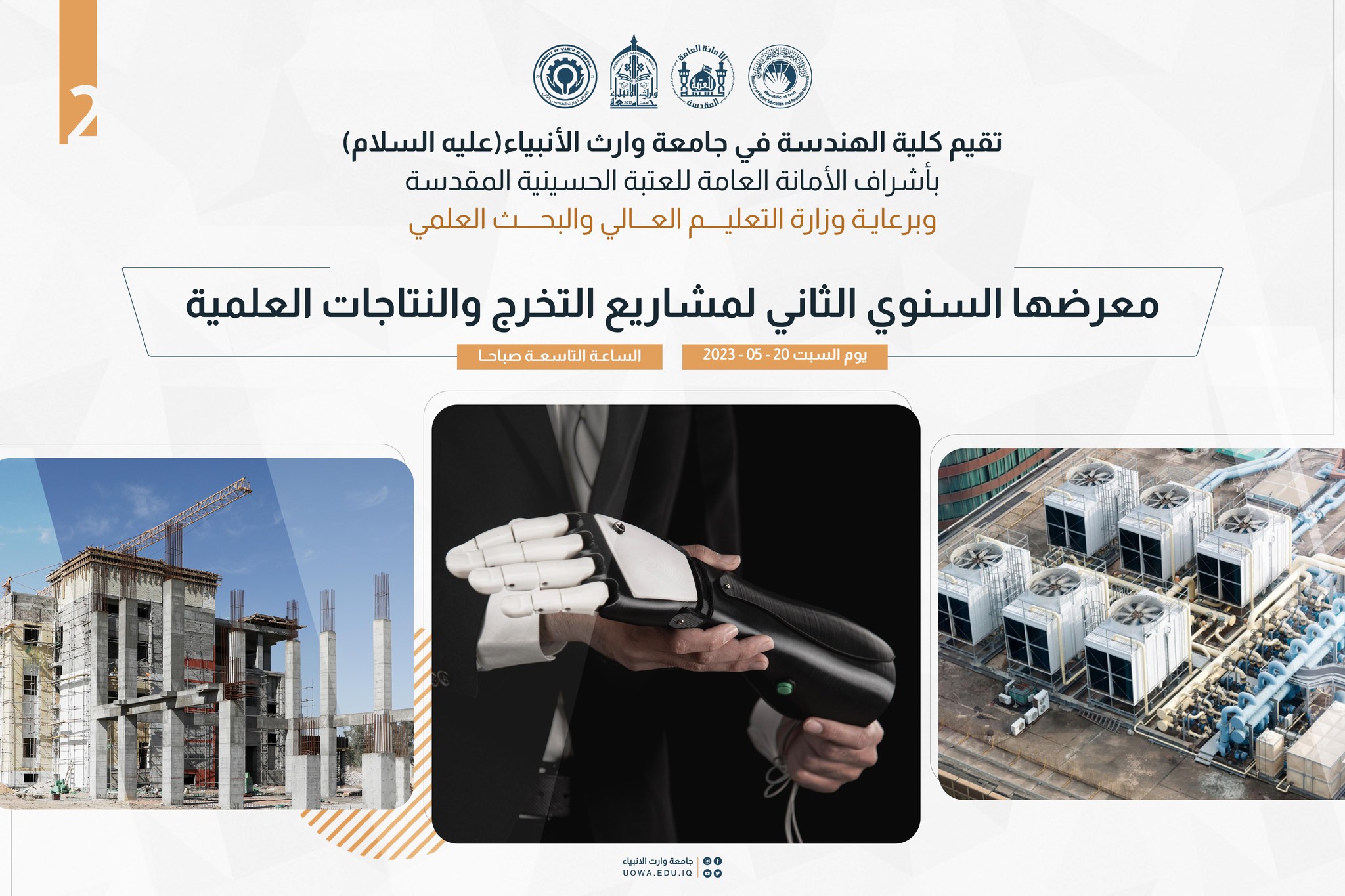 تدعوكم جامعة وارث الانبياء(عليه السلام) لحضور فعاليات "المعرض السنوي الثاني لمشاريع التخرج والنتاجات العلمية" لطلبة كلية الهندسة في العشرين من الشهر الجاري (20/5/2023)  الساعة التاسعة (9:00) صباحاً.